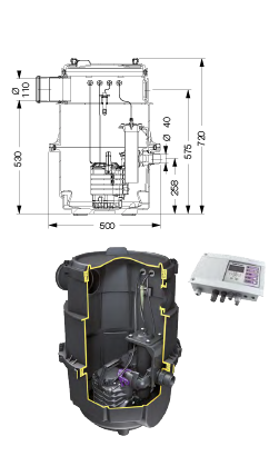 หน่วยปั๊มคู่สำหรับการกำจัดน้ำเสียอุตสาหกรรม / ปริมาณมาก ตัวอย่างเช่นสำหรับสูบน้ำฝนที่อยู่ต่ำกว่าระดับพื้นดินหรือใช้กับเครื่องแยกไขมัน ใช้ได้กับถังปริมาตร 200 300 และ 450 ลิตร